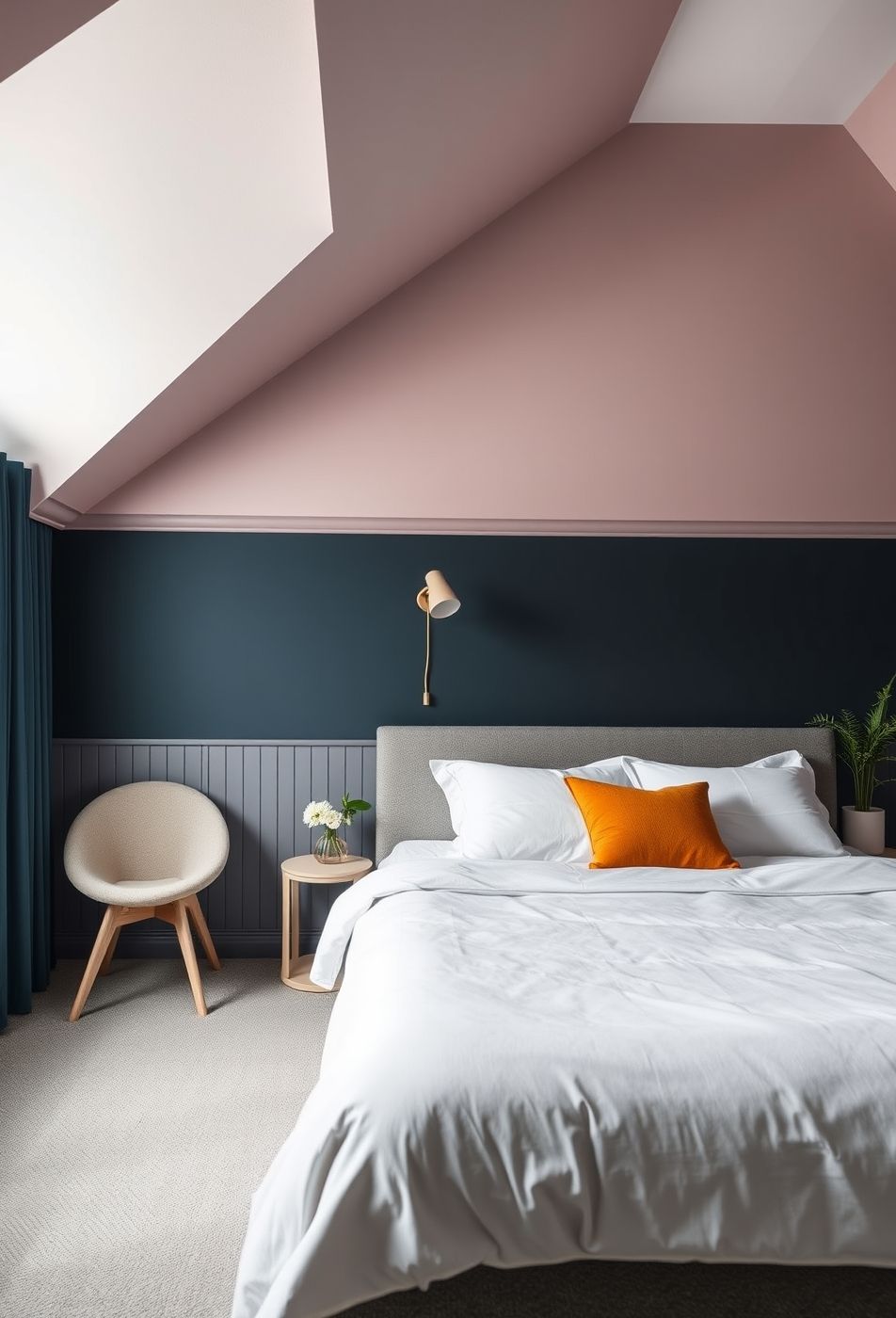 L’image révèle une chambre à coucher qui ose une esthétique à la fois apaisante et sophistiquée. La palette de couleurs est audacieuse, mais harmonieuse : un rose poudré enveloppant le haut des murs et le plafond en pente contraste magnifiquement avec un bleu marine profond qui tapisse la partie inférieure des murs. Une frise de couleur plus claire crée une transition subtile entre ces deux nuances, ajoutant une touche d’élégance classique. Un lambris gris clair ajoute de la texture et un intérêt visuel discret au niveau inférieur du mur.