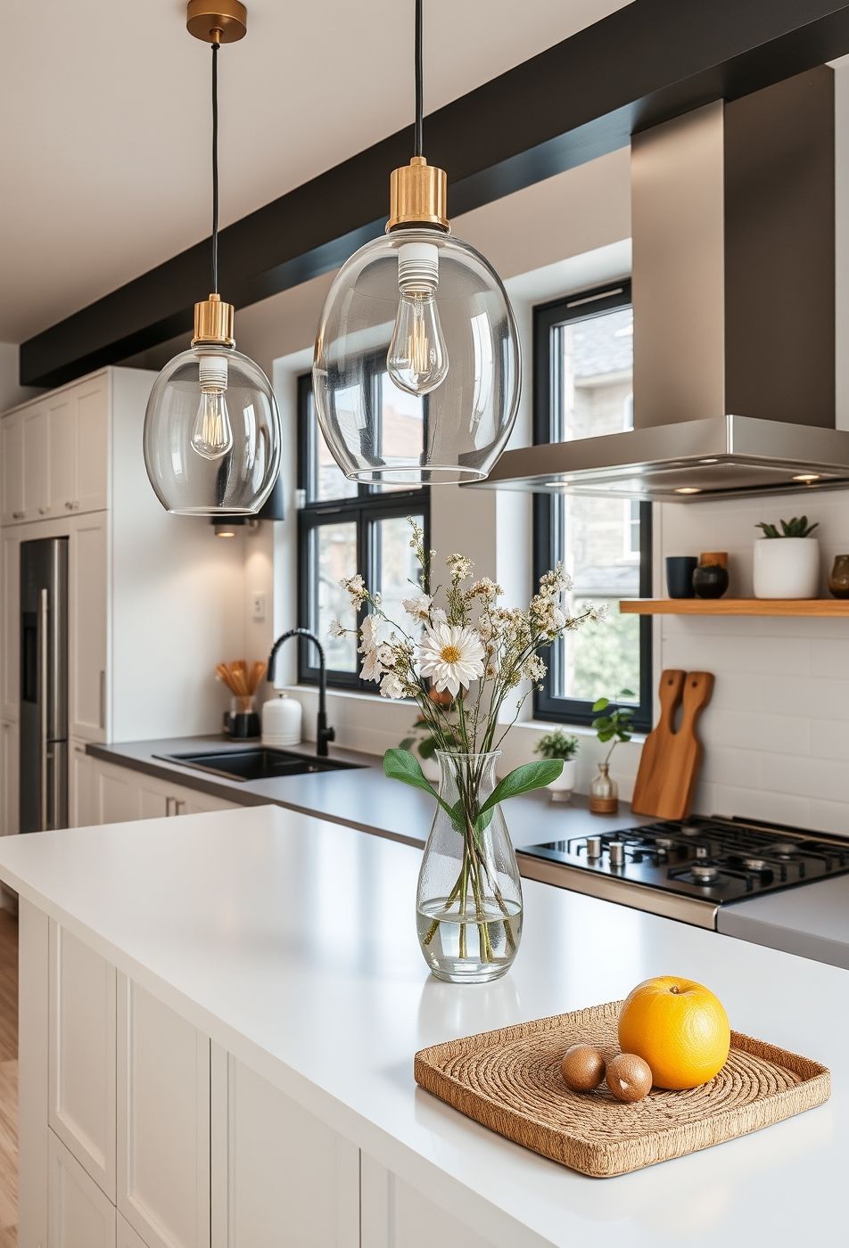 La cuisine capturée dans cette image respire une élégance discrète et une luminosité naturelle. La palette de couleurs est dominée par le blanc immaculé des armoires et du comptoir de l’îlot central, contrastant magnifiquement avec les accents noirs des encadrements de fenêtres et de la poutre au plafond. L’acier inoxydable de la hotte ajoute une touche de modernité, tandis que les suspensions en verre avec des détails dorés diffusent une lumière chaleureuse et mettent en valeur les ampoules Edison à filament. L’ensemble crée une sensation d’espace et d’ouverture, accentuée par la présence de fleurs fraîches dans un vase transparent sur l’îlot.