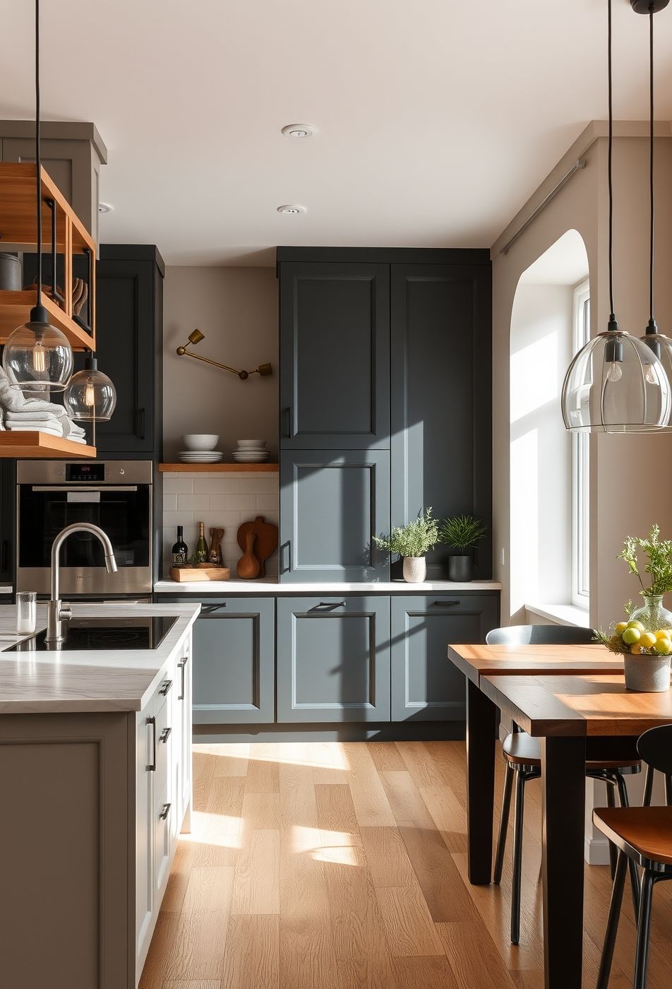 Cette cuisine présente une esthétique à la fois moderne et chaleureuse, avec une touche scandinave discrète. La couleur dominante est un gris-bleu foncé élégant, utilisé pour les armoires, qui contraste magnifiquement avec le plancher en bois clair. Des étagères en bois brut ajoutent une note rustique et chaleureuse, adoucissant l’aspect épuré des armoires. La lumière naturelle abondante, filtrant à travers une fenêtre arquée, met en valeur les détails et crée une ambiance douce et invitante.