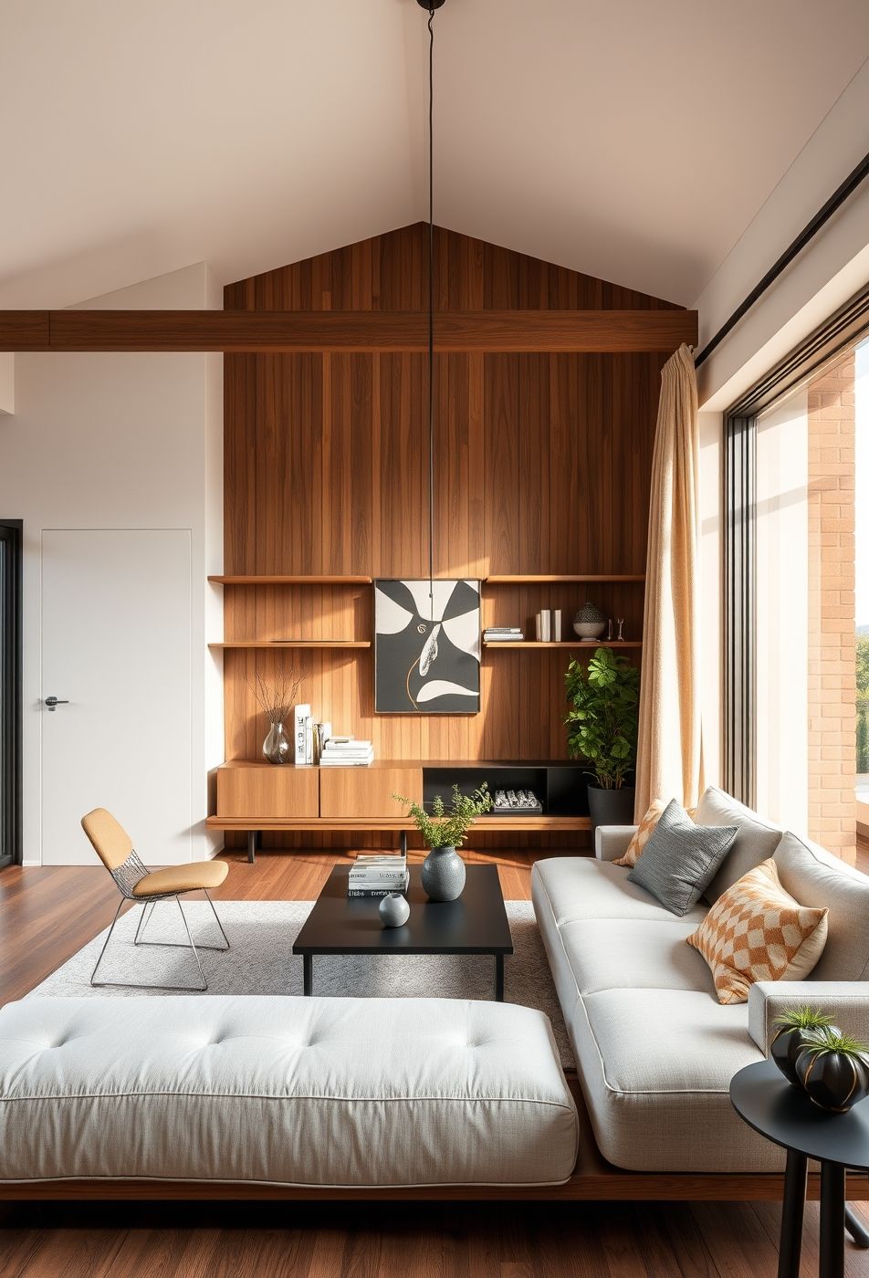 Cette pièce respire une sophistication décontractée, où le minimalisme rencontre une chaleur organique. Le mur d’accent en bois riche, avec sa forme de maison épurée et ses étagères intégrées, est le point focal incontestable. Des objets décoratifs choisis avec soin, des livres, des plantes et une œuvre d’art graphique en noir et blanc animent l’espace sans l’encombrer. L’éclairage zénithal discret, suspendu au centre de la pièce, met en valeur la hauteur du plafond et diffuse une lumière douce.